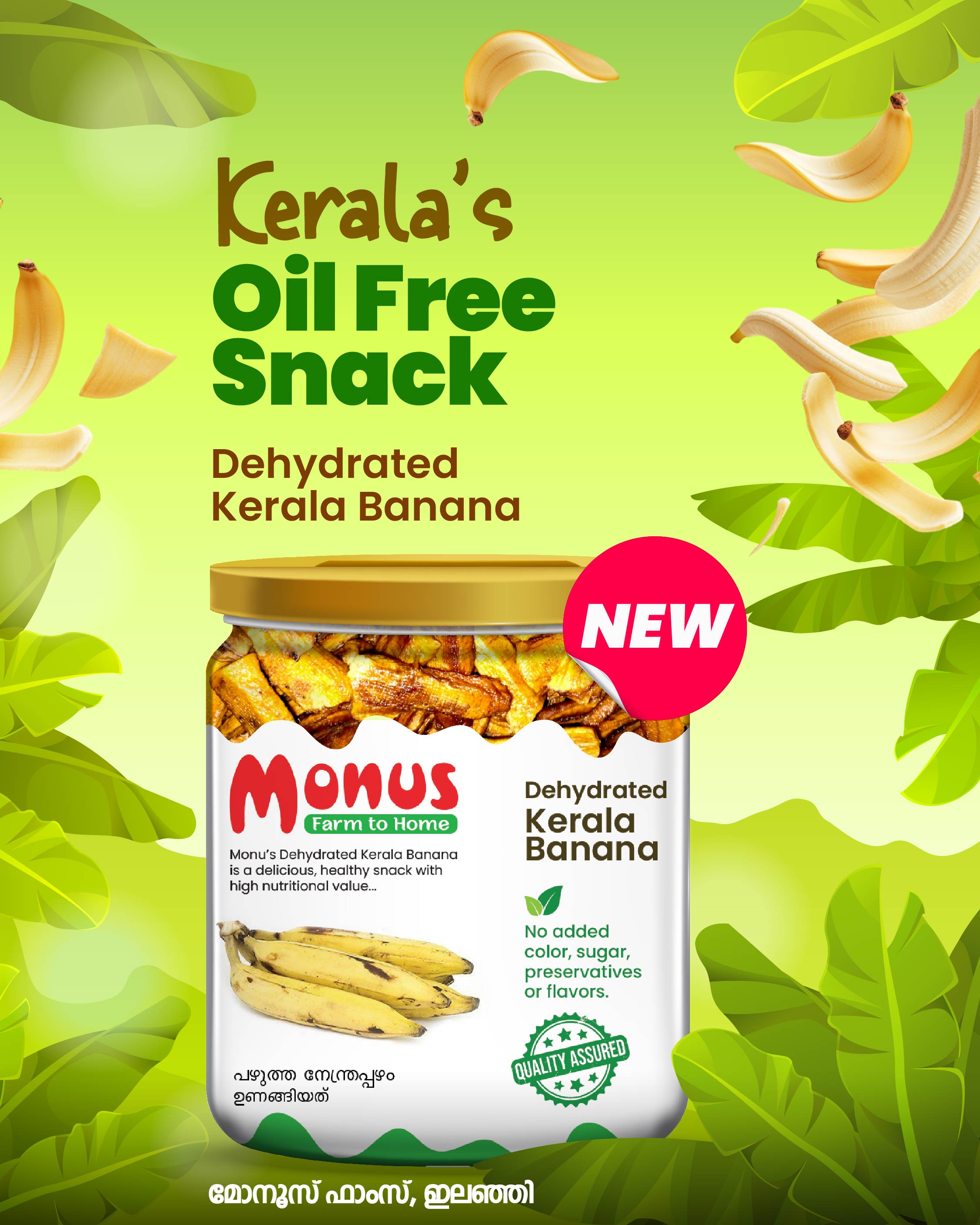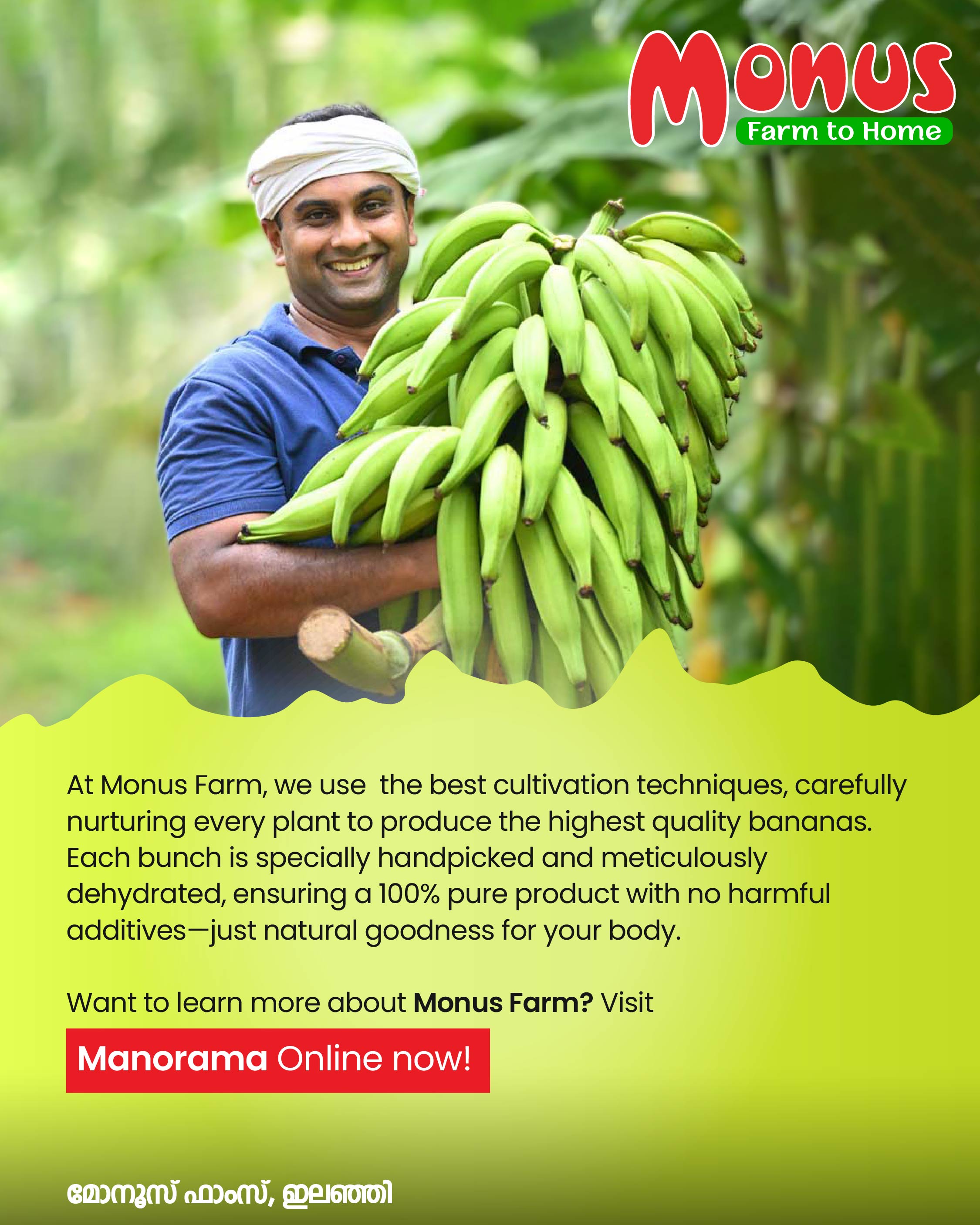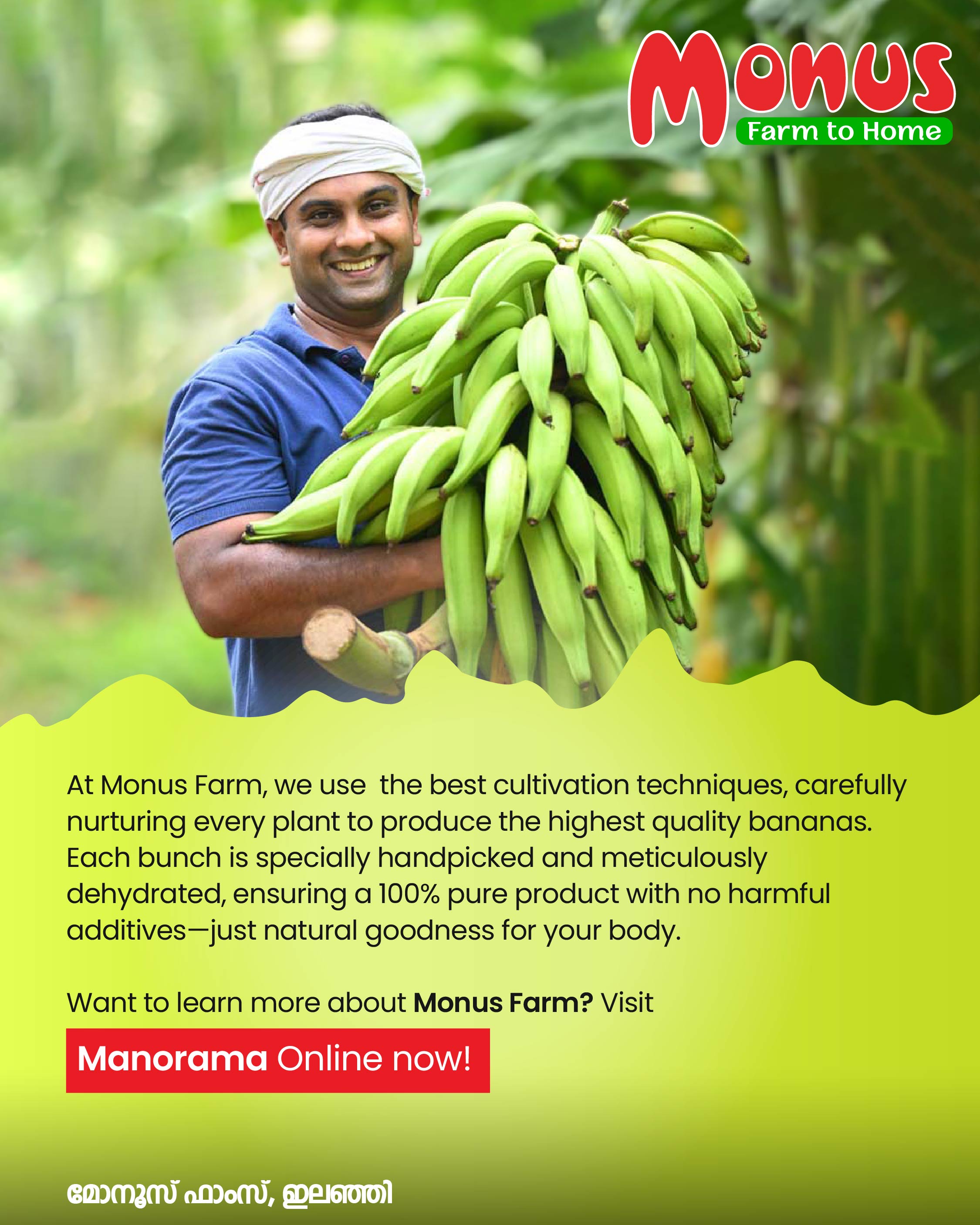Behind every healthy bite of Monus Farm’s Oil-Free Banana Snacks lies the untold story of a farmer’s dedication, passion, and perseverance. From Ilanji, Kerala, Monus Farm stands as a symbol of purity and quality—growing every banana with care and turning it into nature’s finest snack.